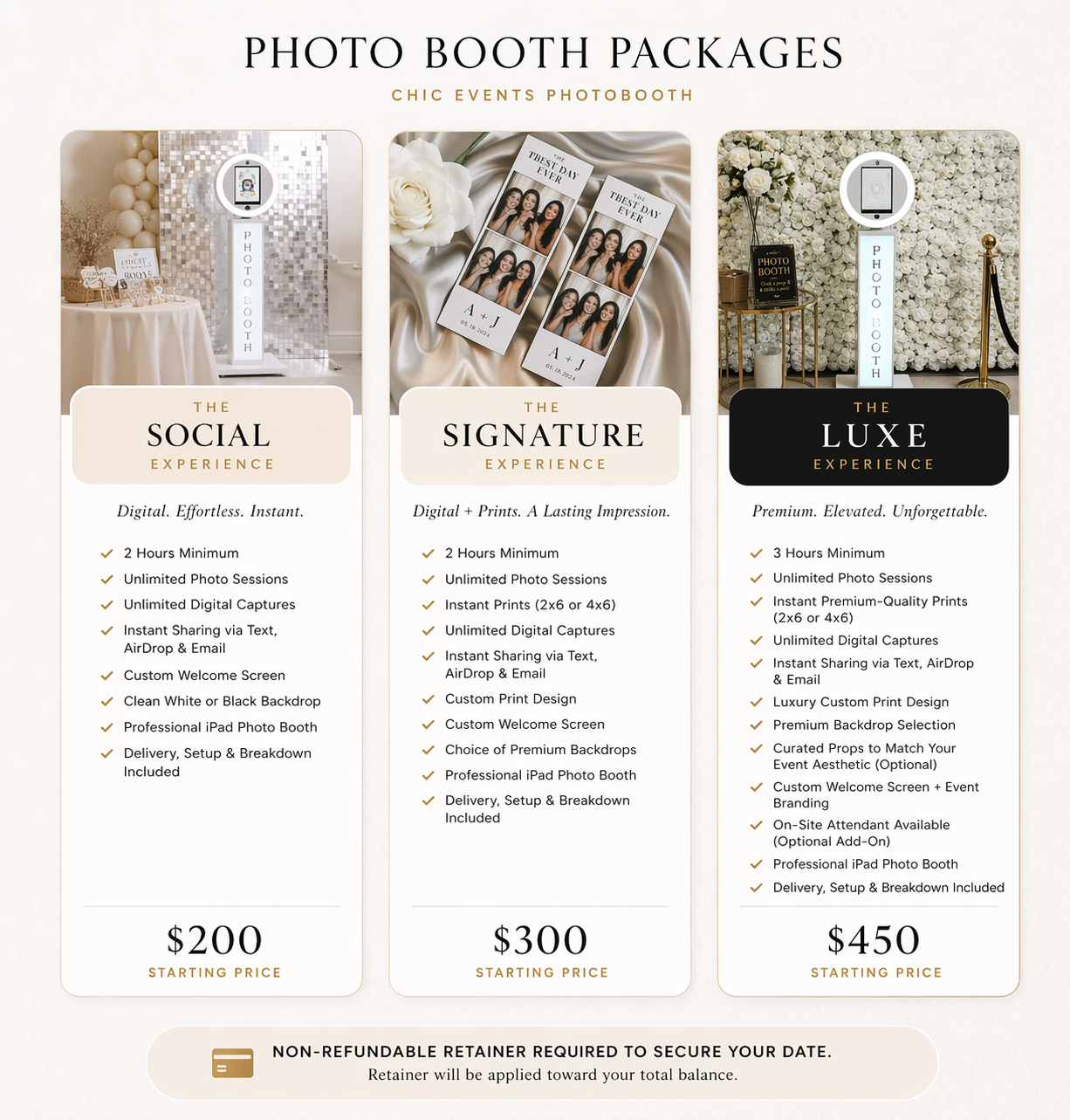 Choose from our luxury photo booth experiences designed for weddings, birthdays, and unforgettable events.